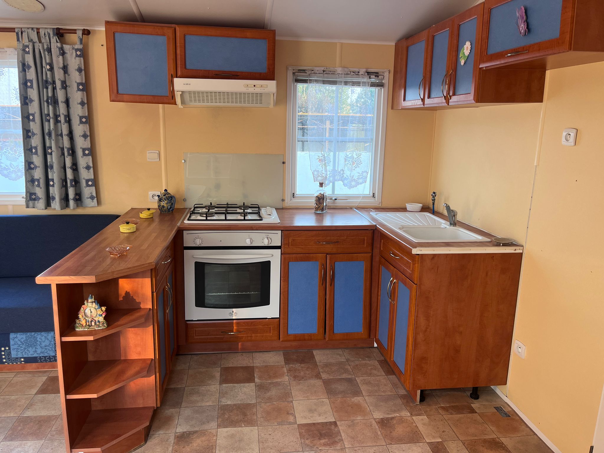 Interior: calentador de gas, placa de 4 fuegos de gas, horno.