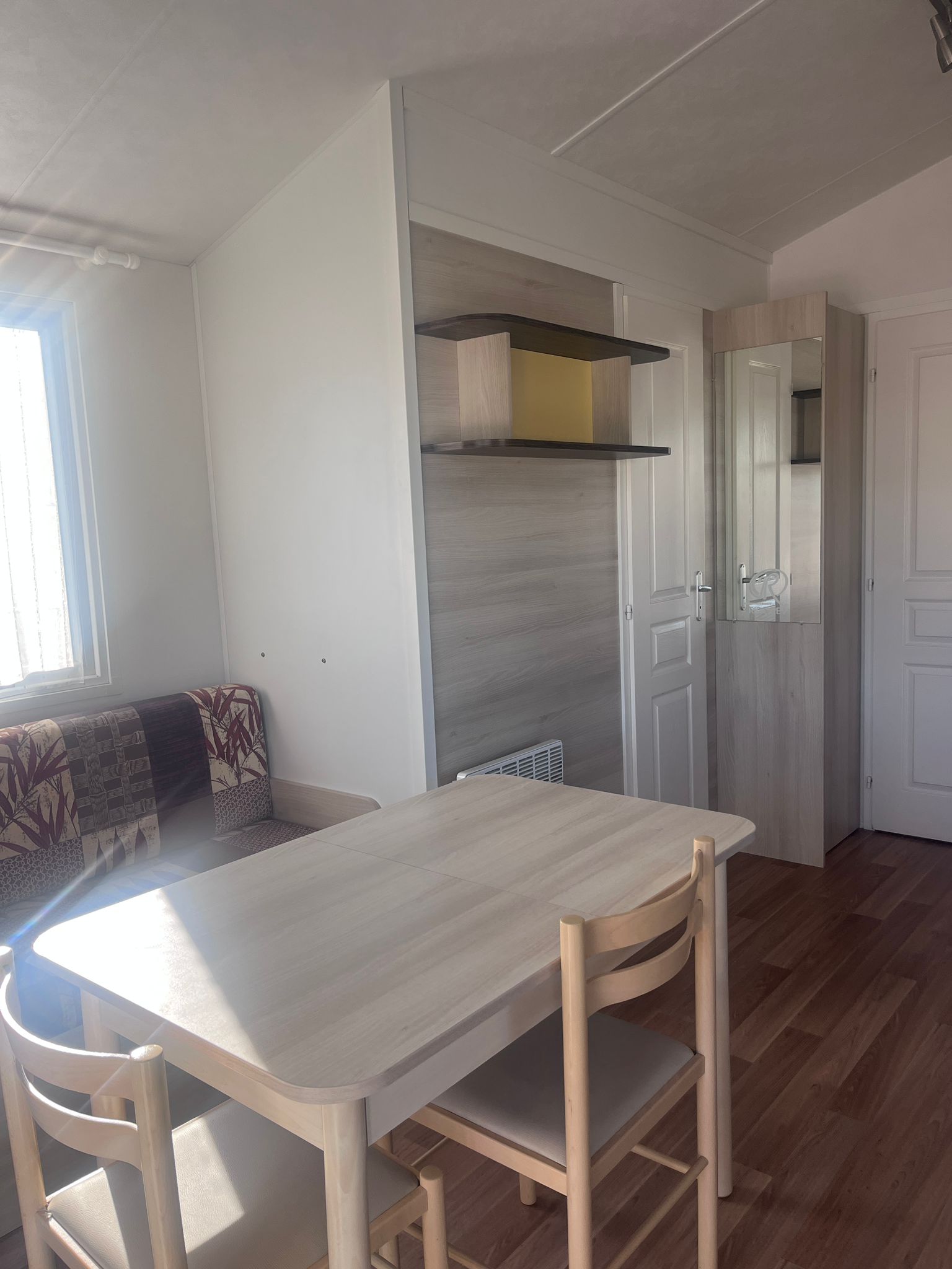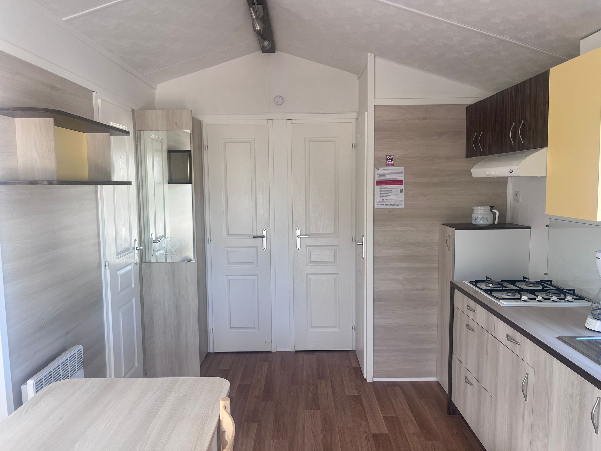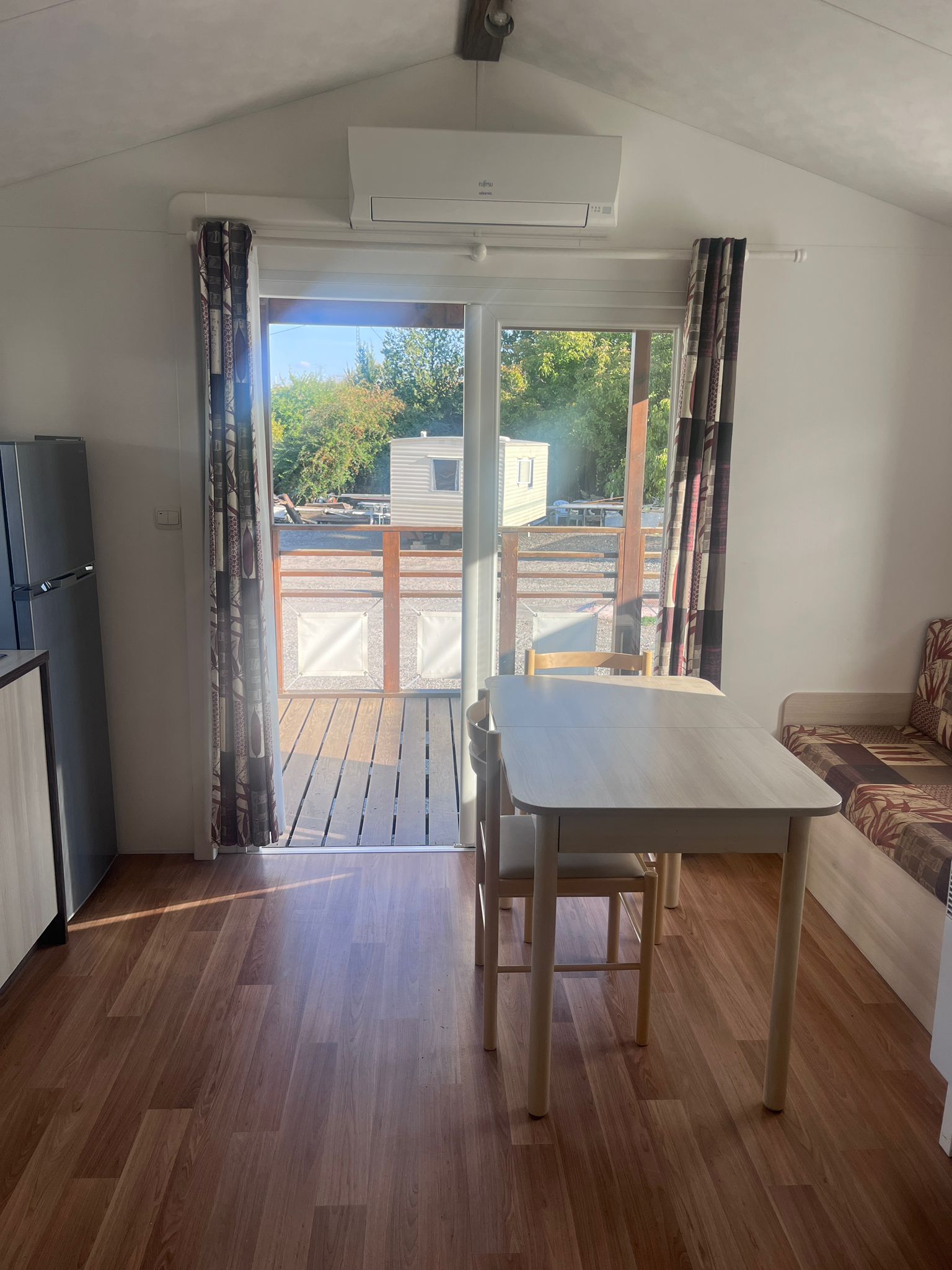 Frigorífico, calentador y placa de gas, climatizador, radiador eléctrico en salón, porche integrado.
